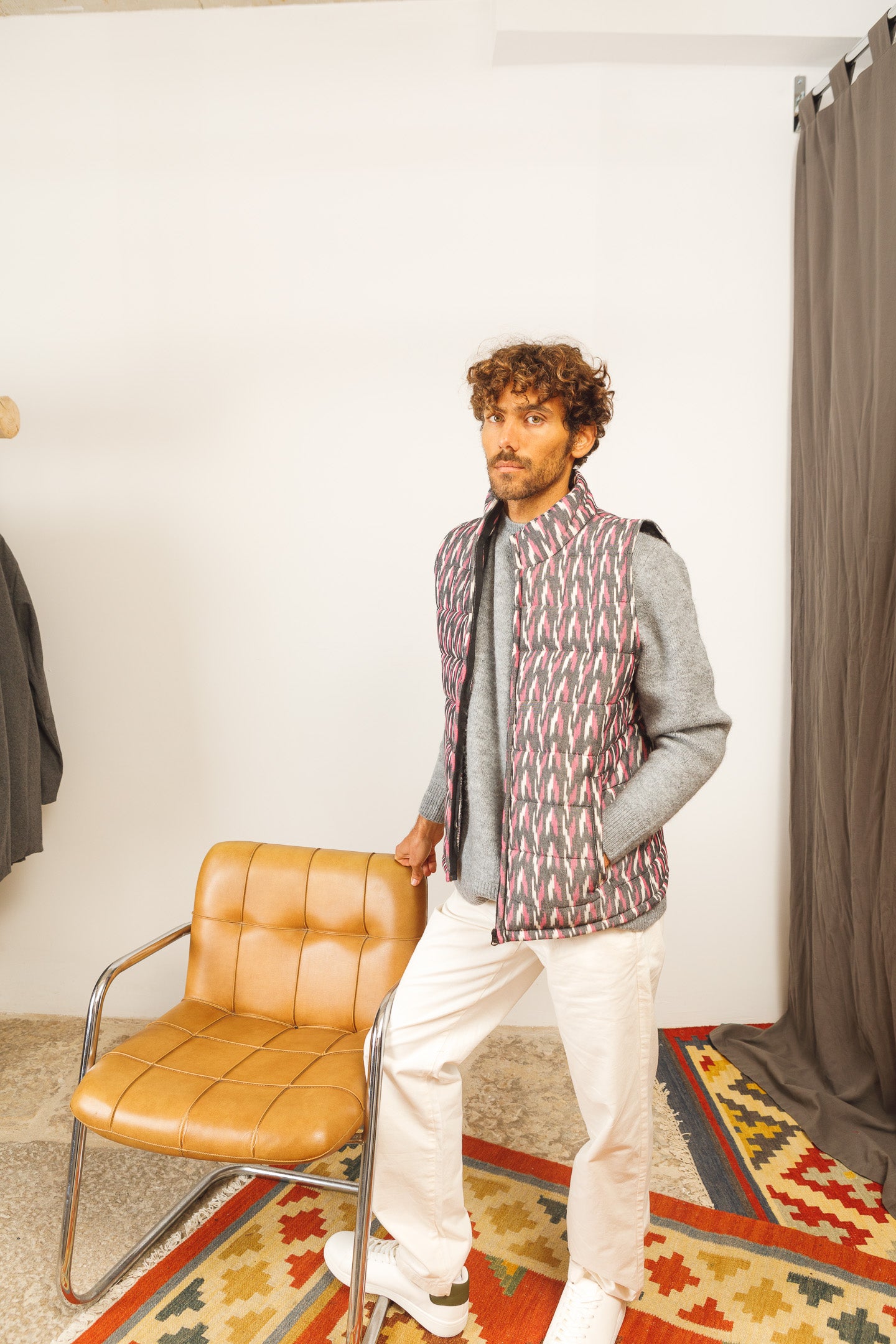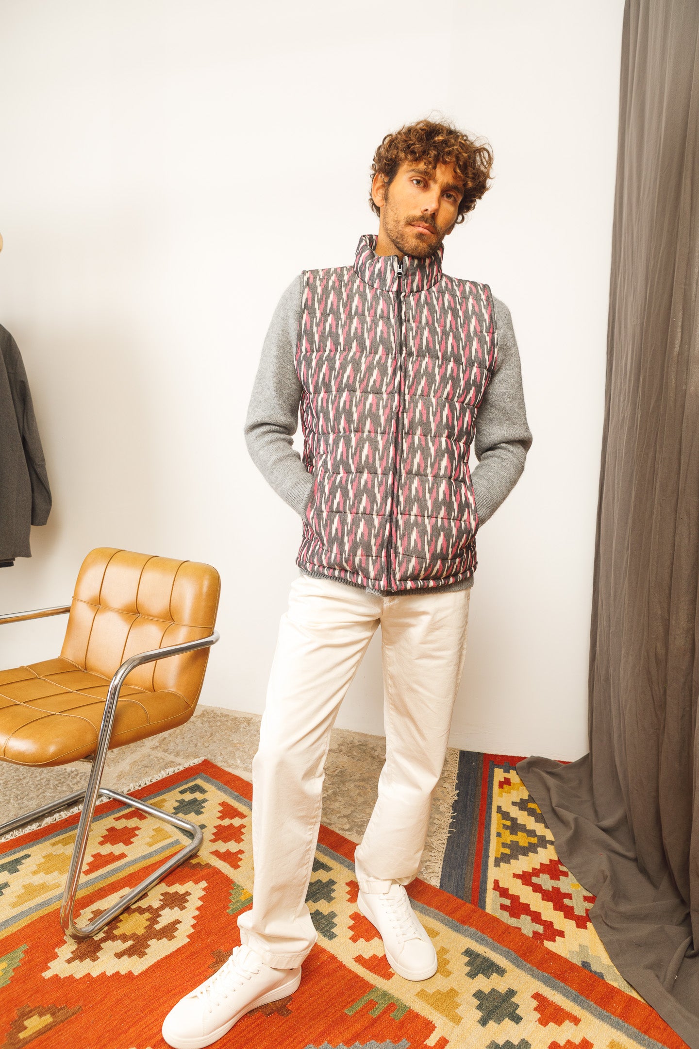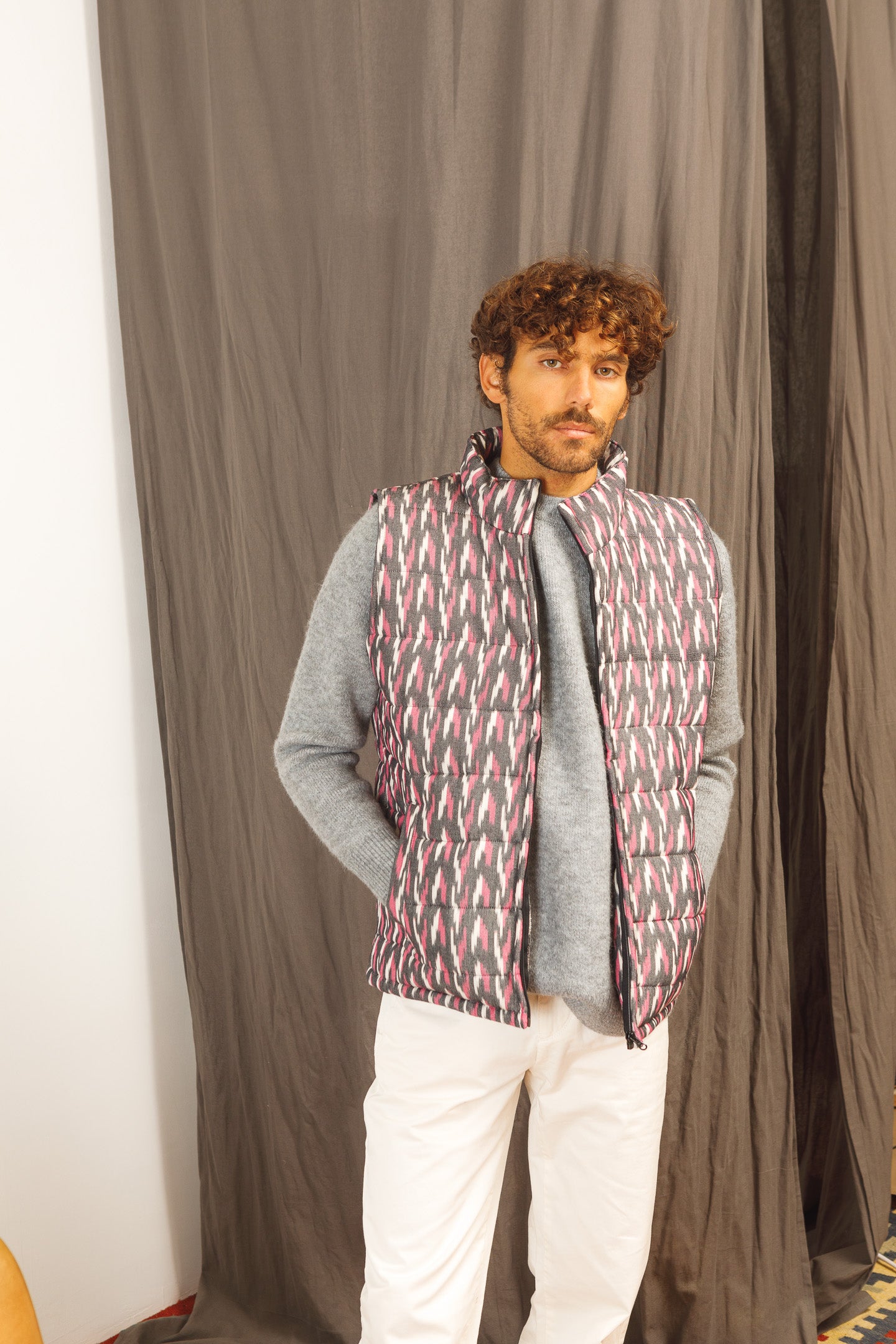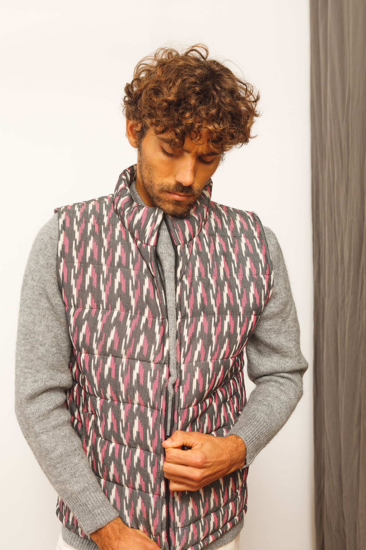 (at last) a sustainable puffer vest with the coolest design. hand-woven and hand-printed. #slowfashion - it takes 45 days to produce enough fabric for 30 pieces.