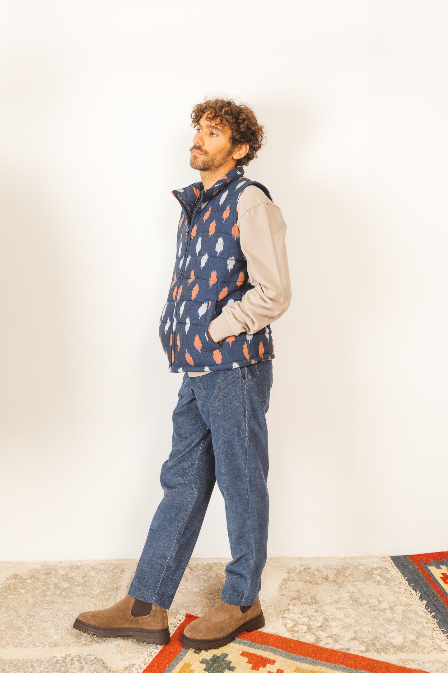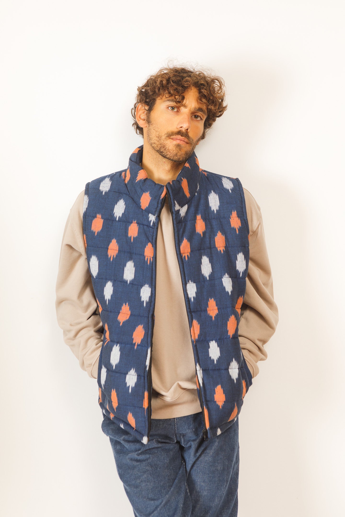 (at last) a sustainable puffer vest with the coolest design. hand-woven and hand-printed. #slowfashion - it takes 45 days to produce enough fabric for 30 pieces.
