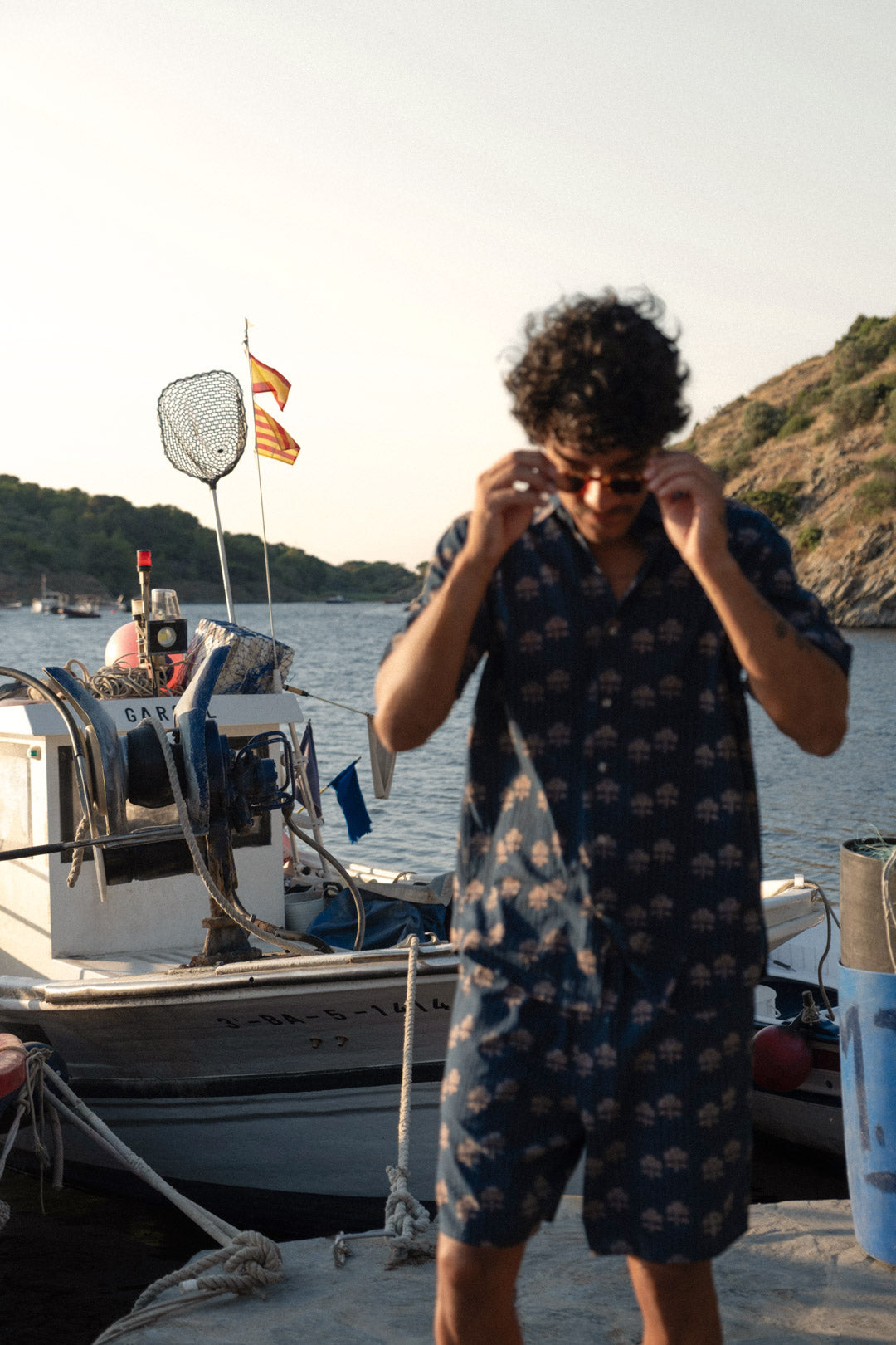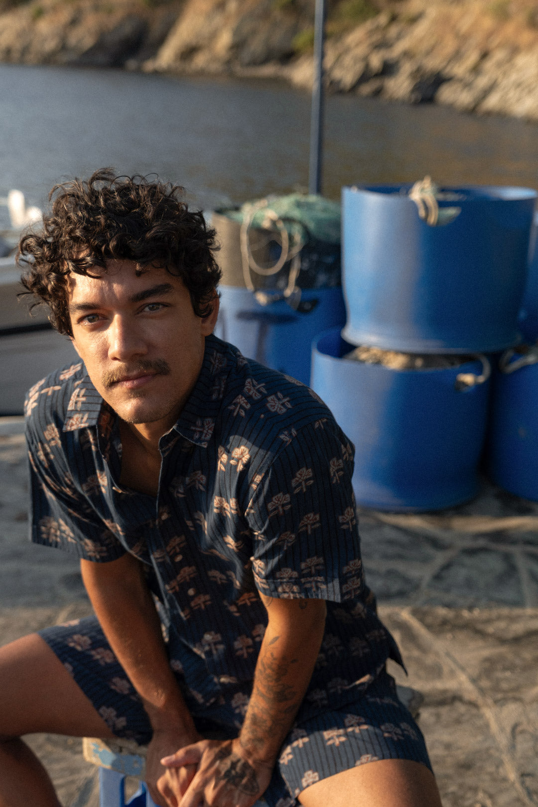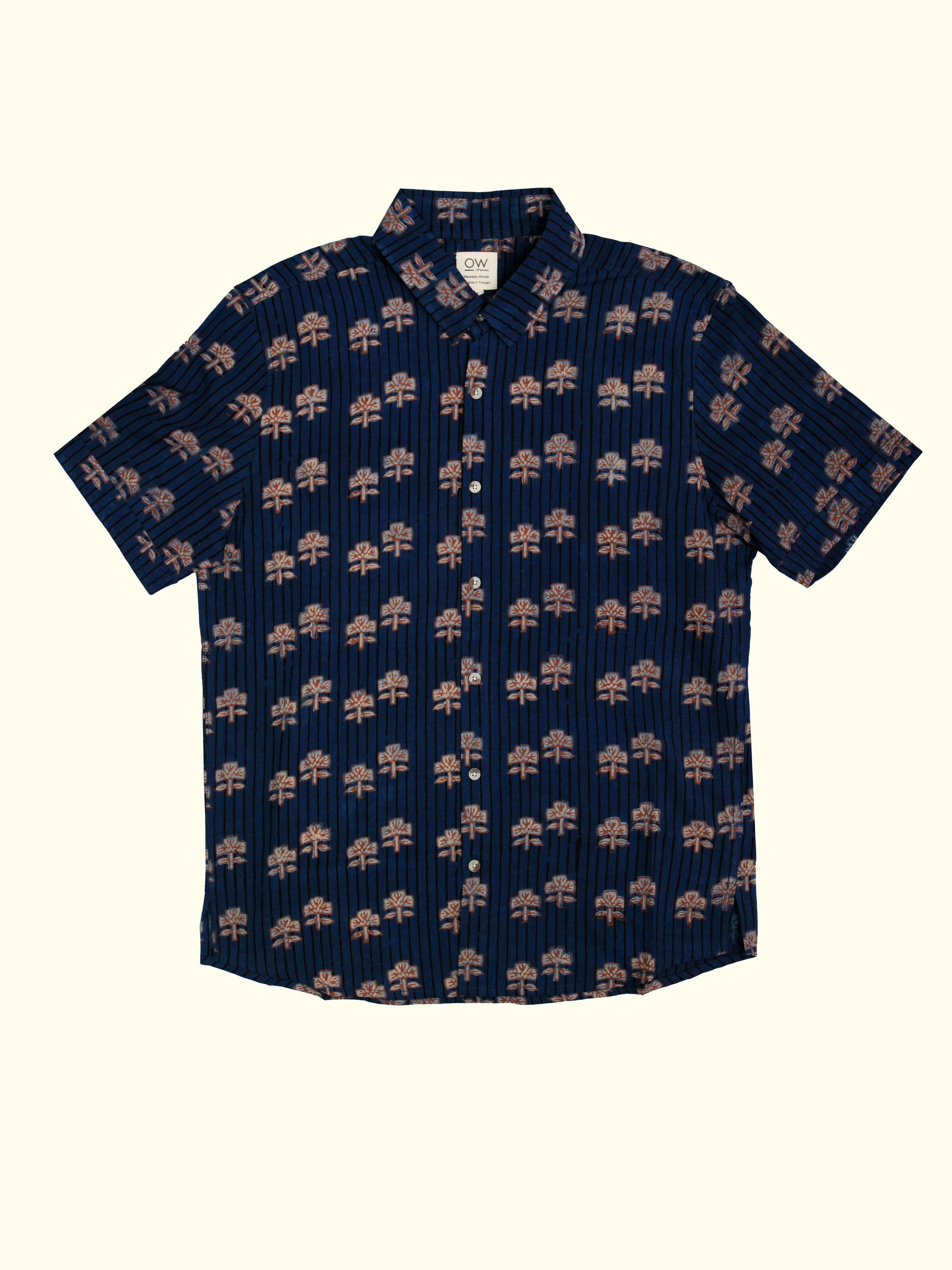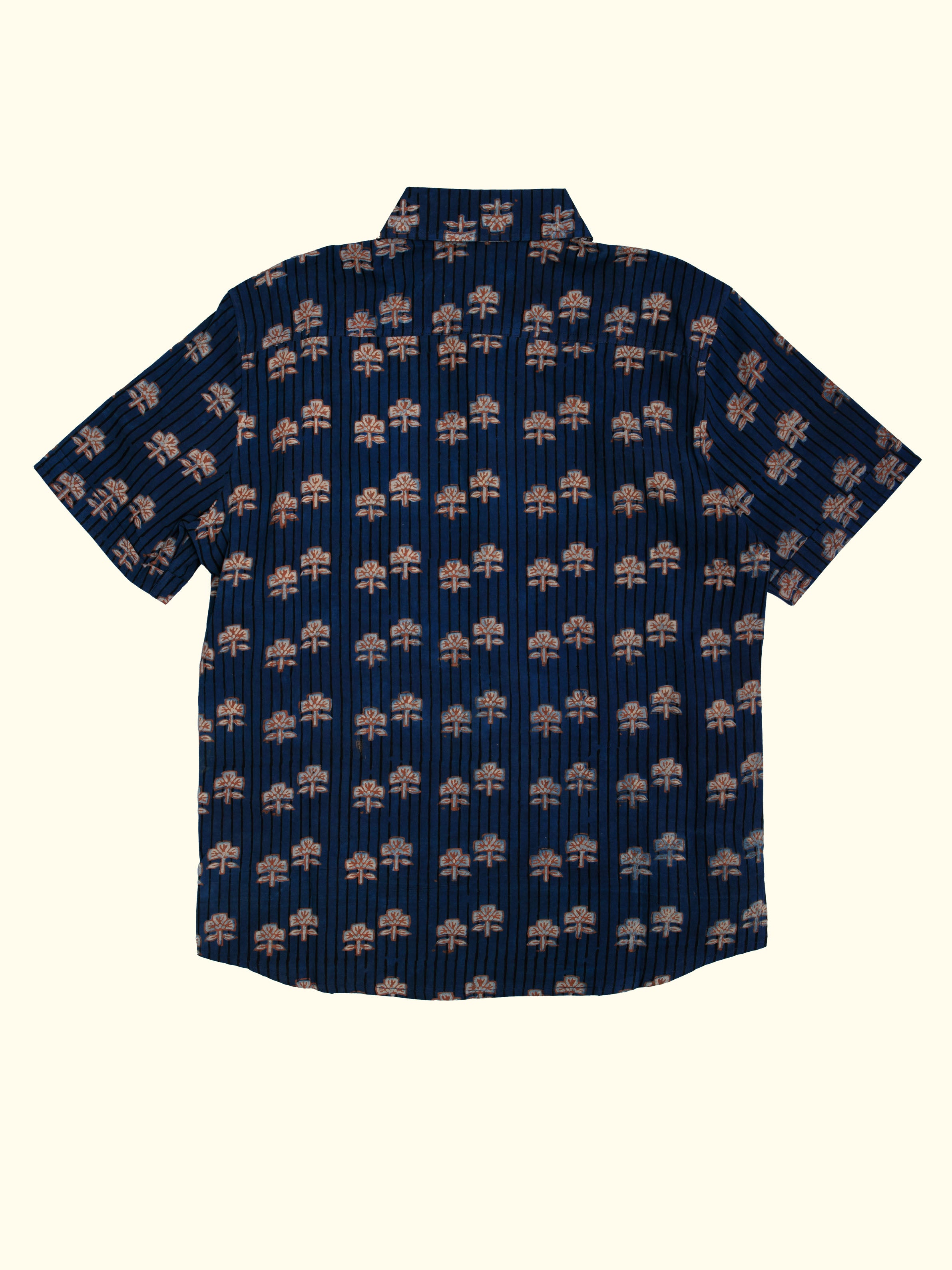 crafted from lightweight 100% cotton, the RAI short-sleeve shirt in blue is printed by hand using the traditional block print technique.