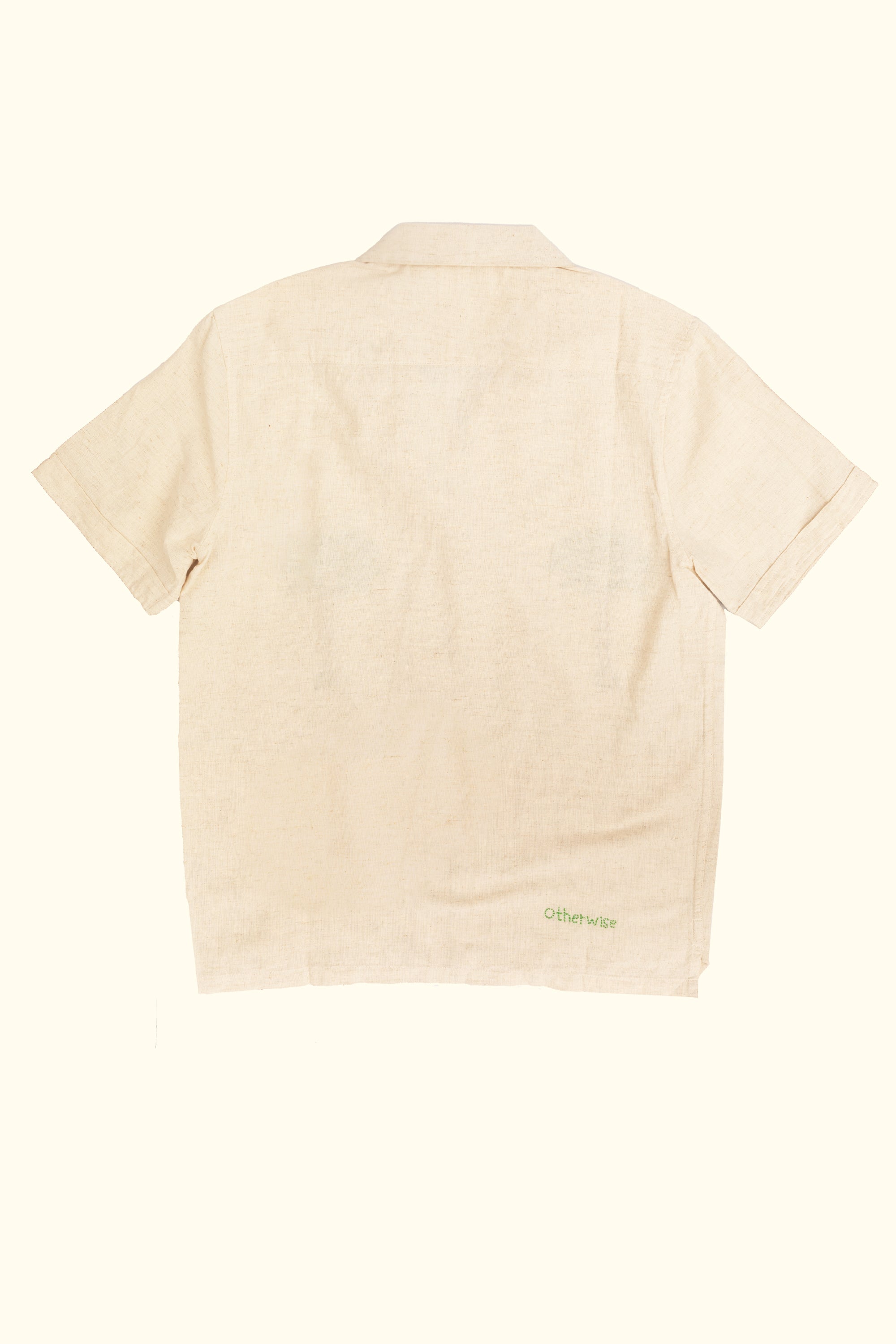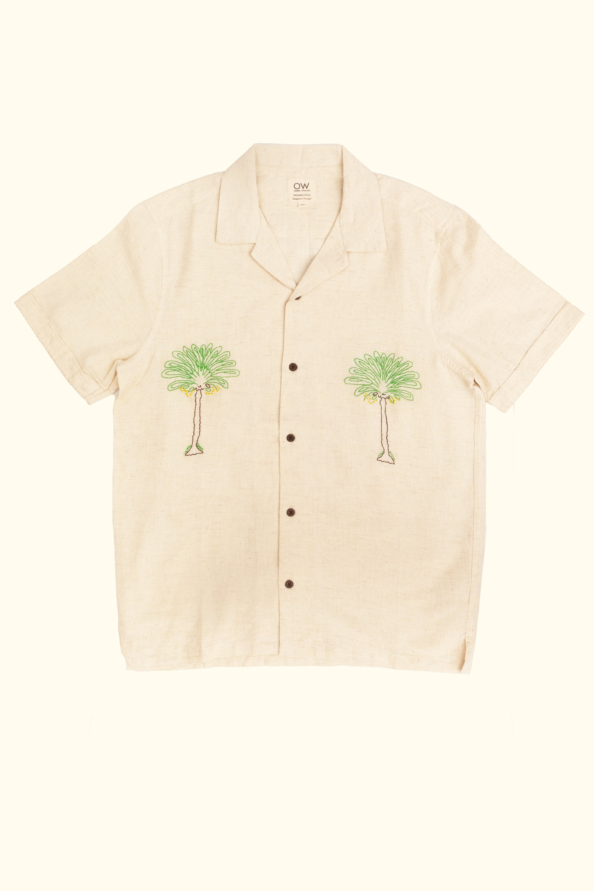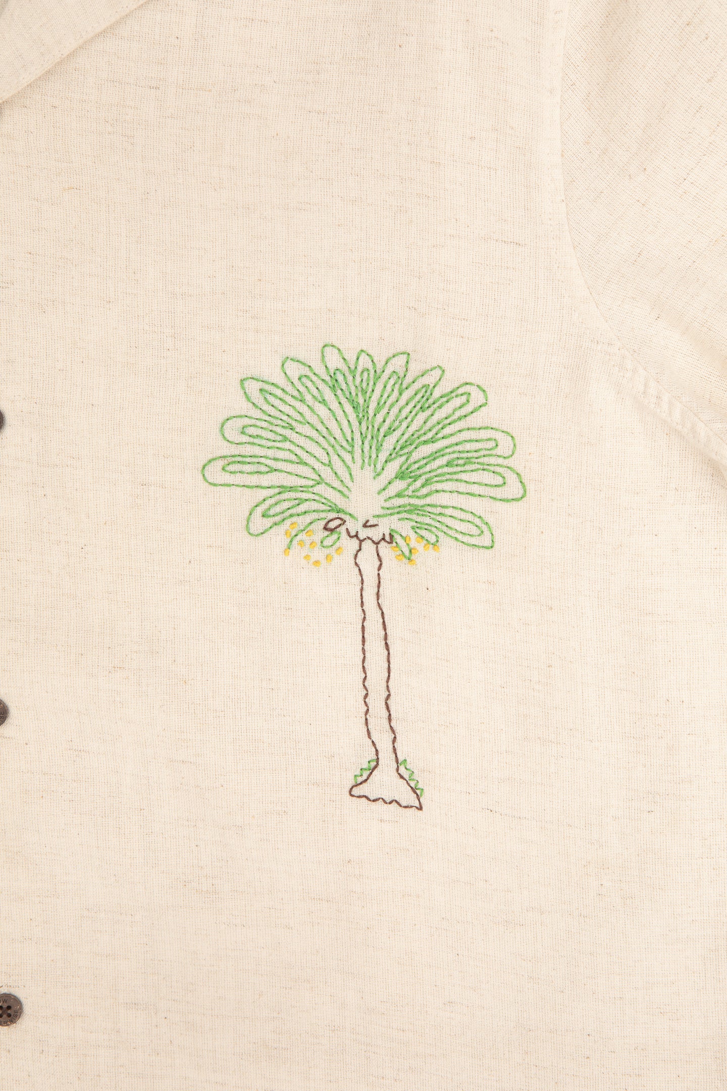 hand-embroidered by women artisans, coconut shirt was crafted in partnership with a startup whose mission is to empower and provide a source of income for rural women in India.