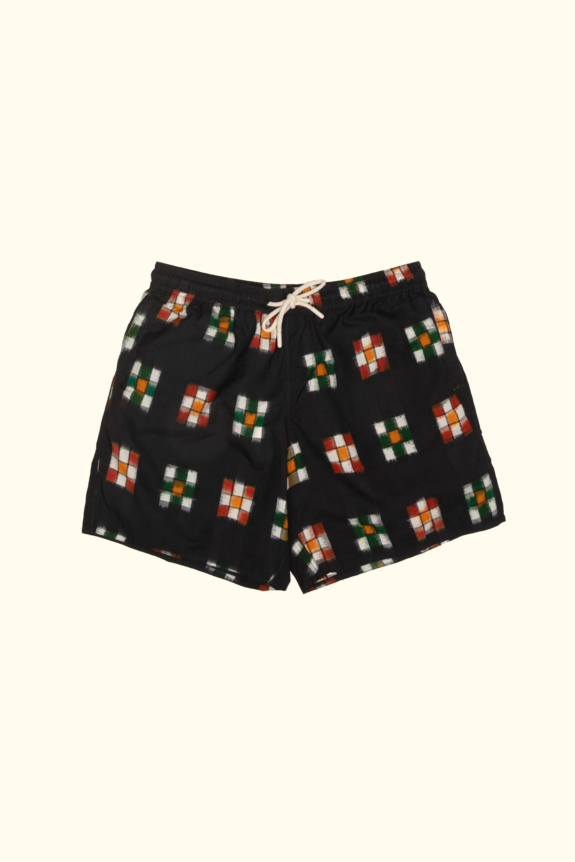 hand-woven and hand-dyed ikat shorts in black. 100% cotton.