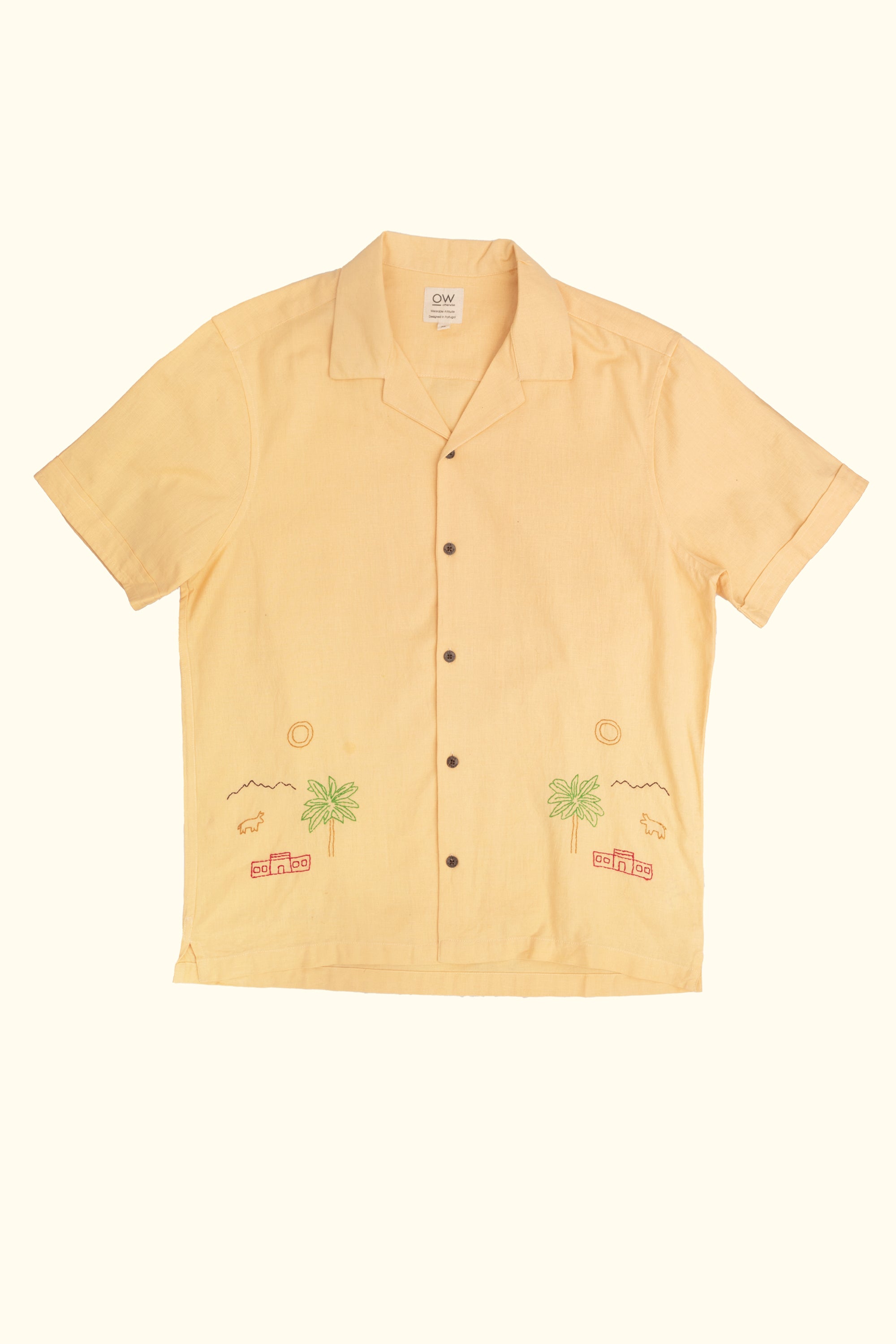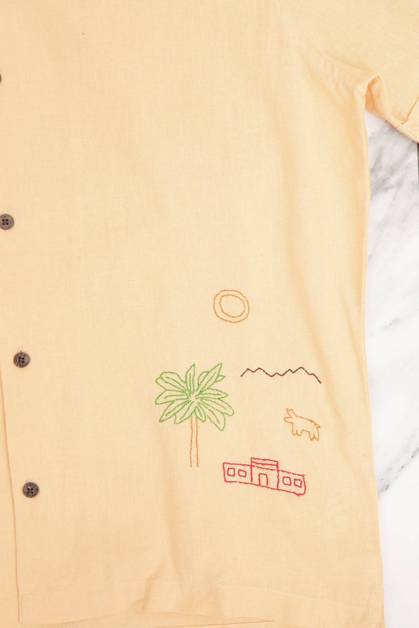 hand-embroidered by women artisans, desert shirt was crafted in partnership with a startup whose mission is to empower and provide a source of income for rural women in India.