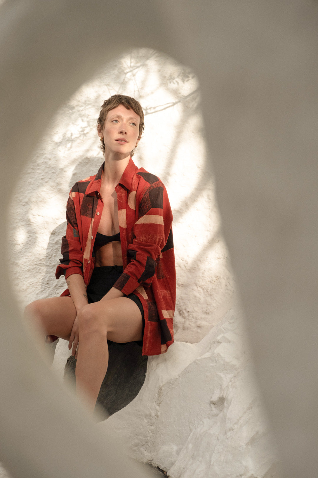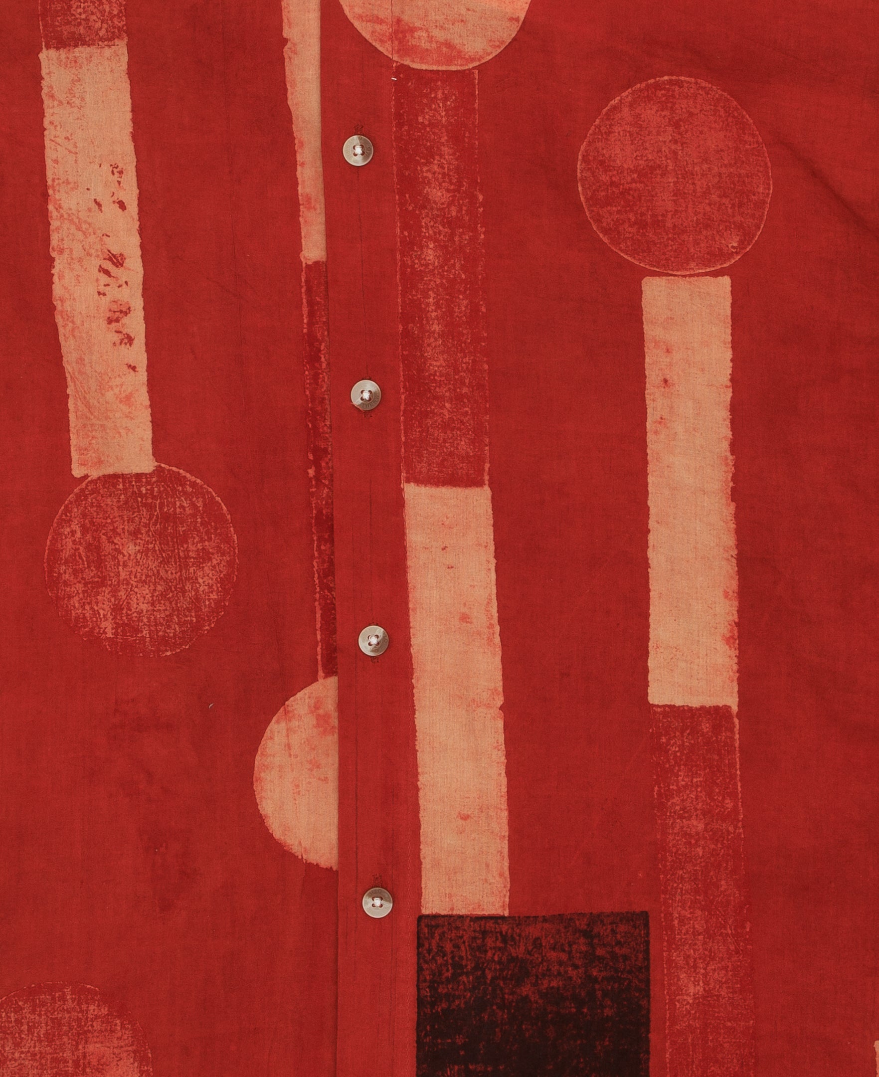 crafted from lightweight 100% cotton, the DOM long-sleeve shirt in red is printed by hand using the traditional block print technique.