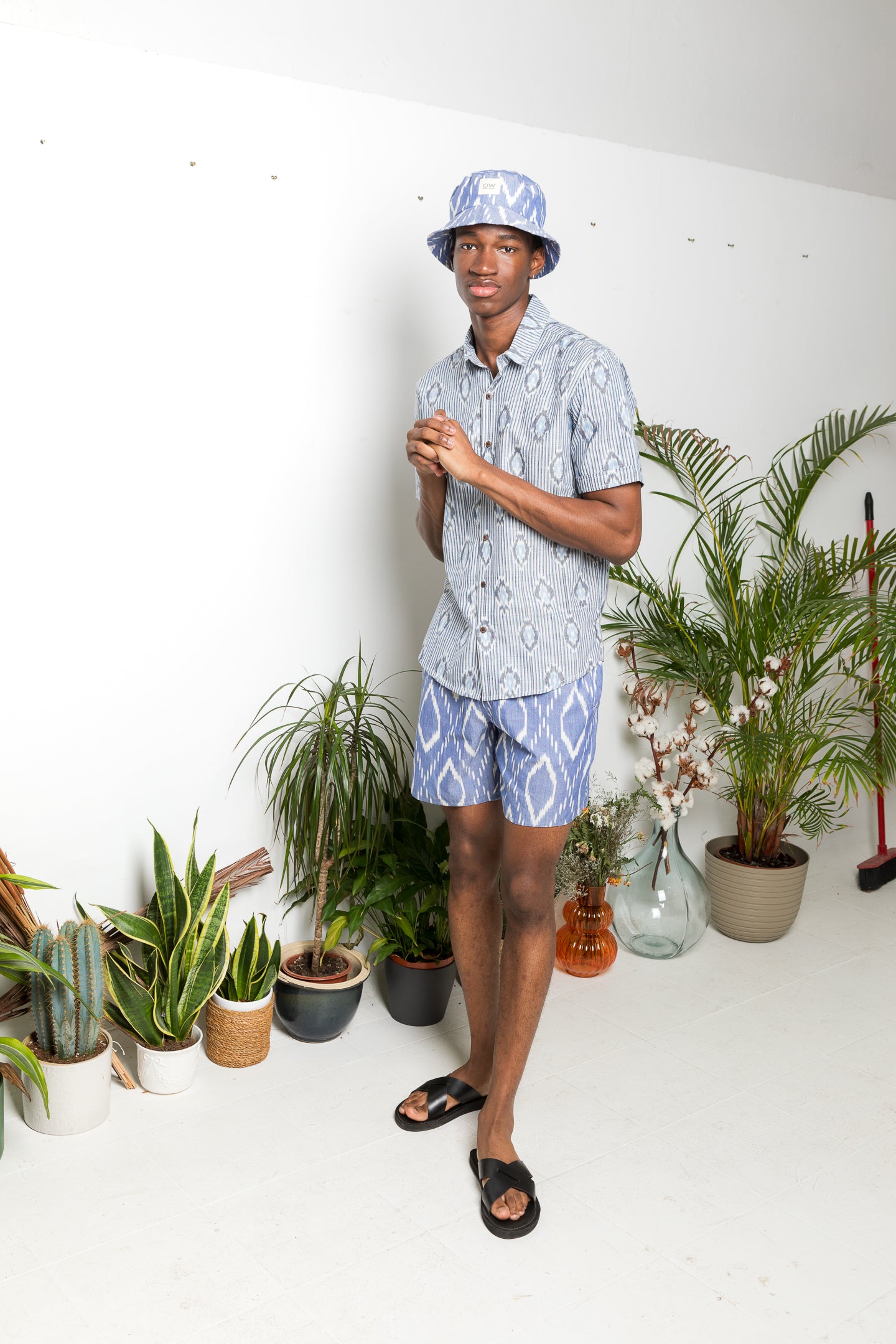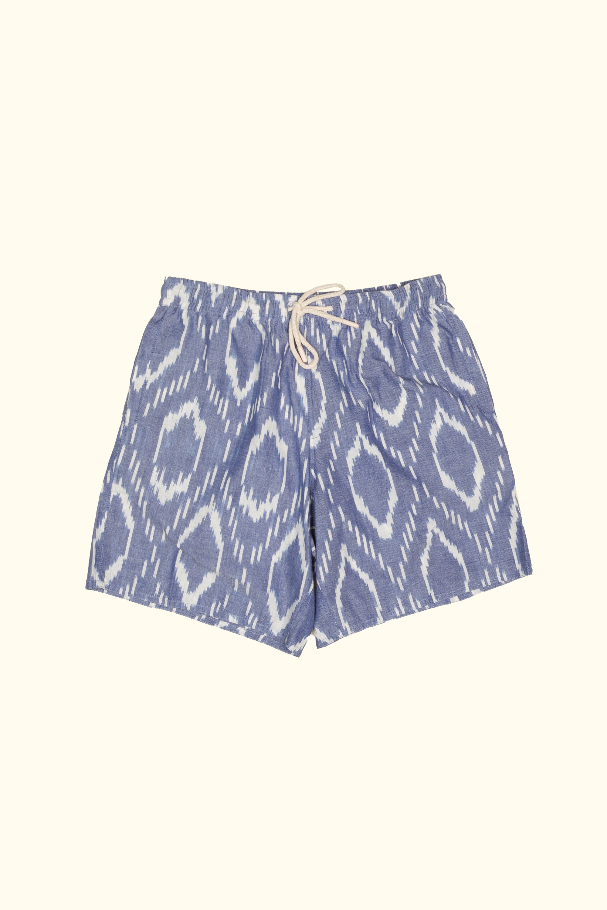 calções de ikat tecidos e tingidos à mão em azul. 100% algodão.